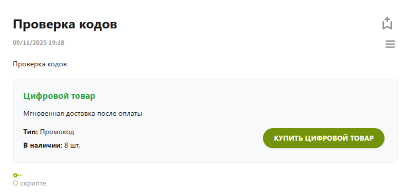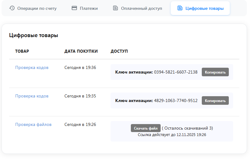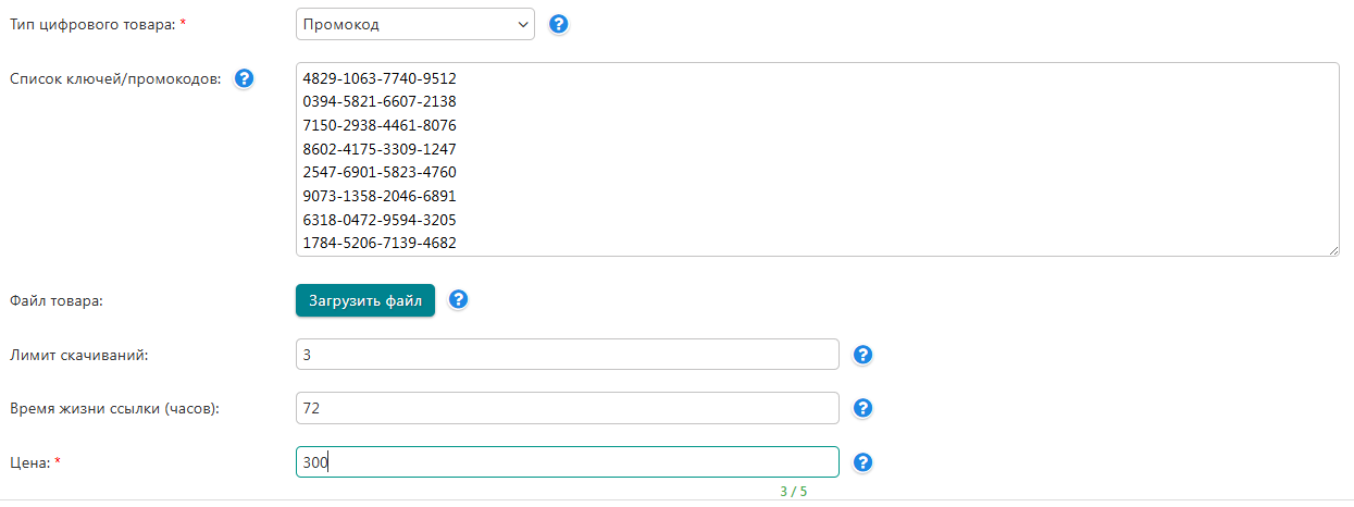 • Автоопределение типа товара (ключ / промокод / файл)