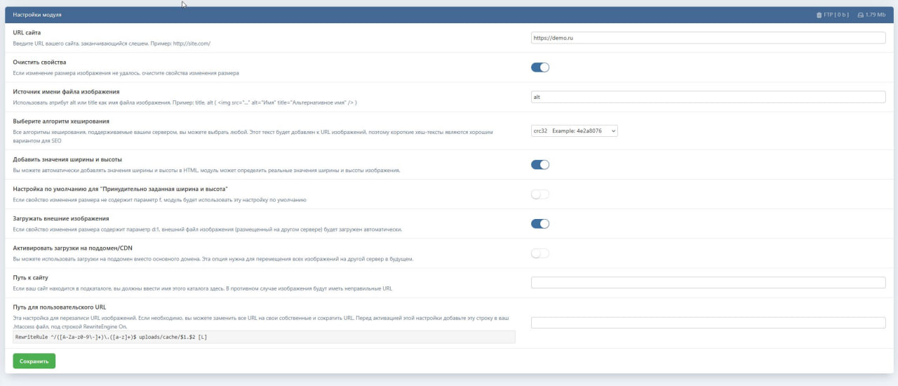 Модуль Image Resizer предназначен для удобного изменения размеров изображений после их загрузки на сайт. Он особенно полезен в ситуациях, когда одно и то же изображение используется в разных частях сайта, но должно отображаться в разных размерах.